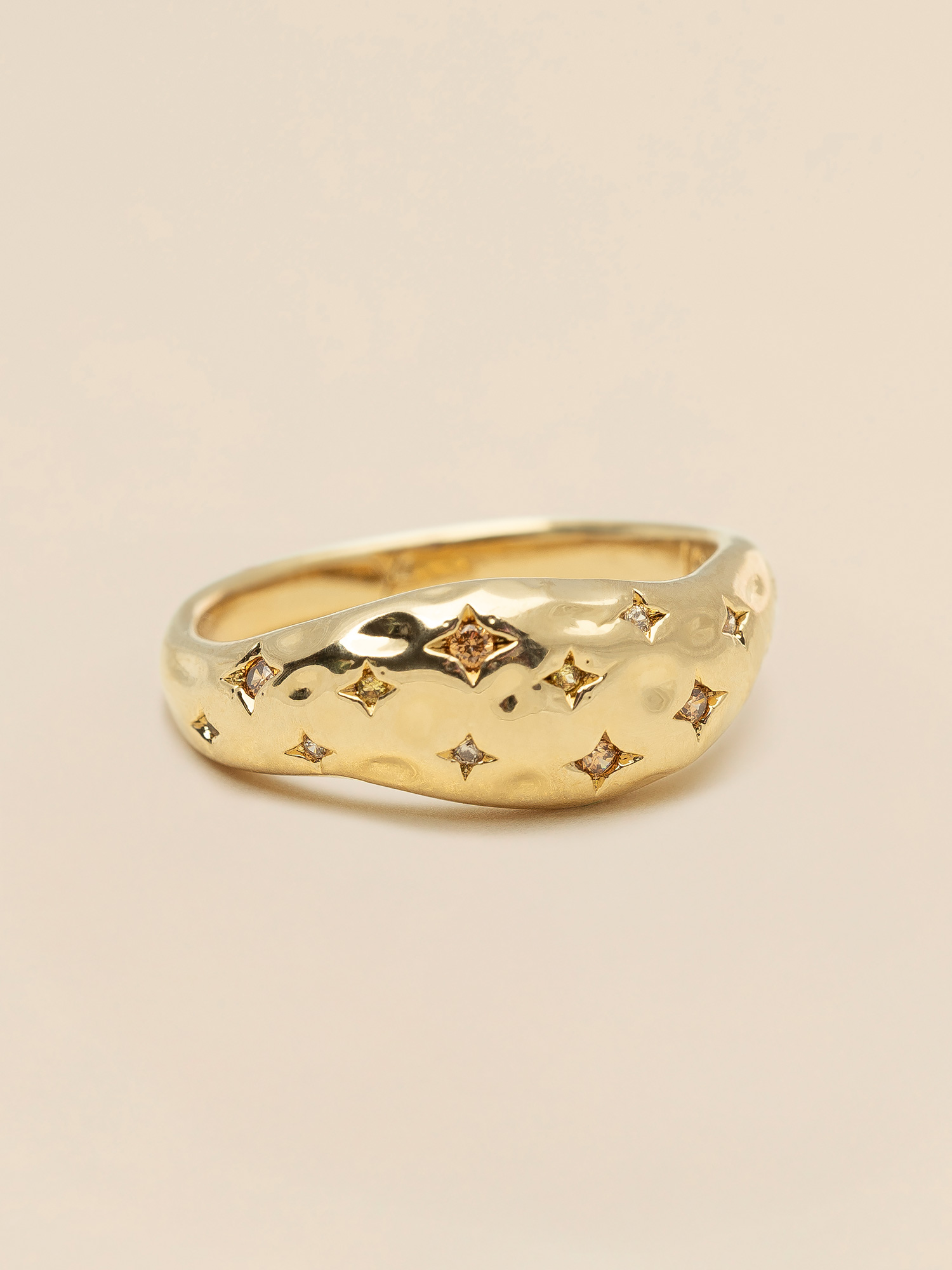 Adorn yourself with cosmic wonder and glimmering night-sky beauty with the star engravings inlaid with champagne and clear stones in this chunky and irregular, gold-plated Bertha ring.