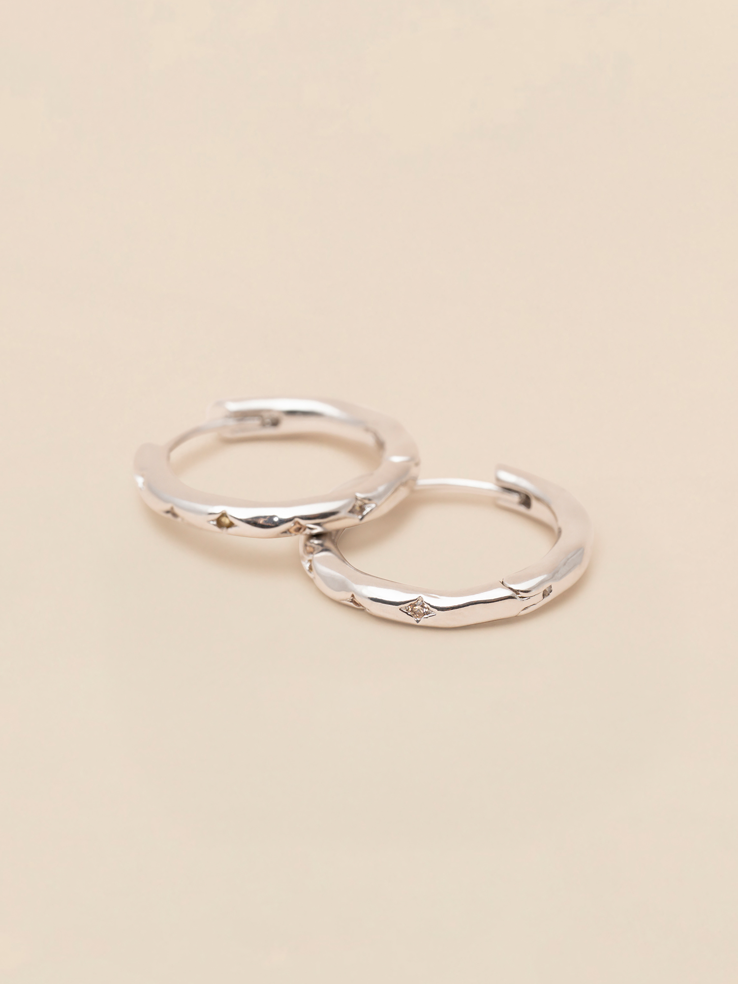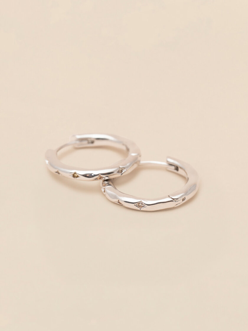 Star engravings cradle a mix of clear and pale champagne stones, presenting a pair of minimalist, classic hoops earrings, with a touch of celesstial sparkle. These irregular silver-plated hoops earrings are an everyday must-have.