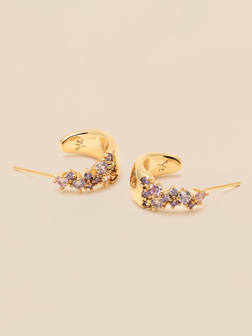Everyday mini hoops with a splash of magic- blushing pink, amethyst and clear cubic zirconia stones in varying sizes take this gold-plated simple design to another level.