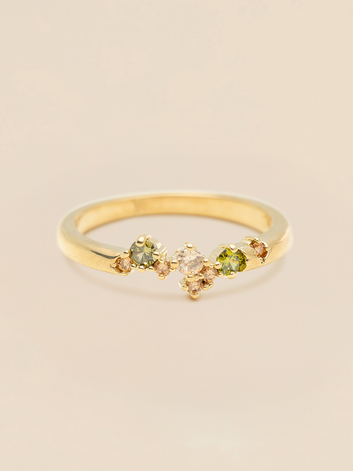 A slimmer alternative to our Meadow Ring, this asymmetric cluster of cubic zirconia stones is nestled amongst granules of gold. Unique with its own personality and perfect for those seeking something delightfully unusual, yet utterly feminine. Set in 18-k gold plated brass, the peridot green, light and dark topaz crystals of varying sizes, leave a splendid trail of sparkle on the hand of any lady. The Petite Meadow Ring can be stacked with the larger Meadow Ring, with each cluster of stones fitting seamlessly into one another.
